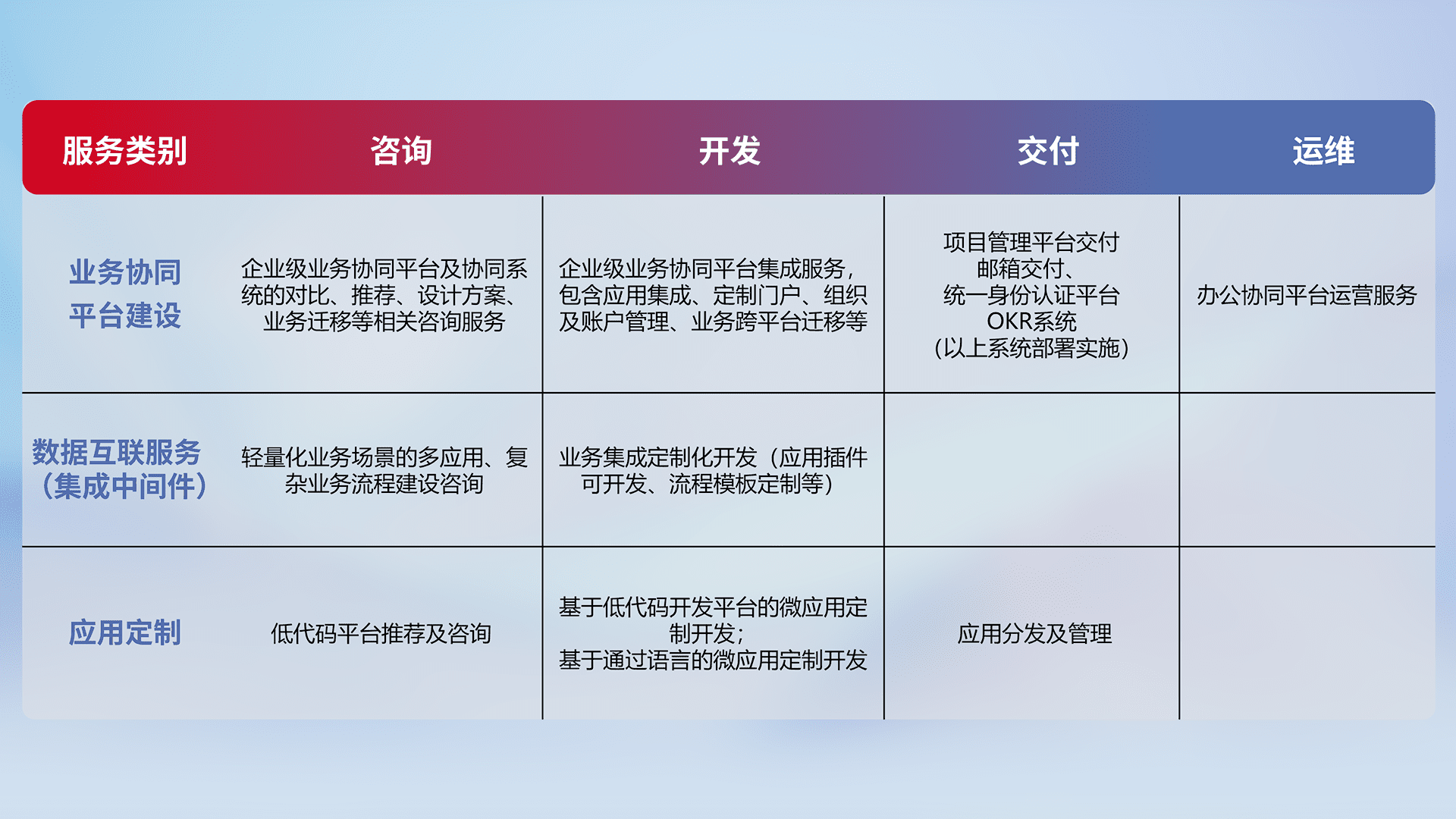 针对钉钉、、、企微、、IDaas等平台级产品提供产品的规划、、、、方案、、、交付、、定制化开发等服务,,,实现如统一协同办公、、、智能客户服务、、、混合会议管理、、、、智能数据查询、、、等业务场景,,实现数字化转型。。