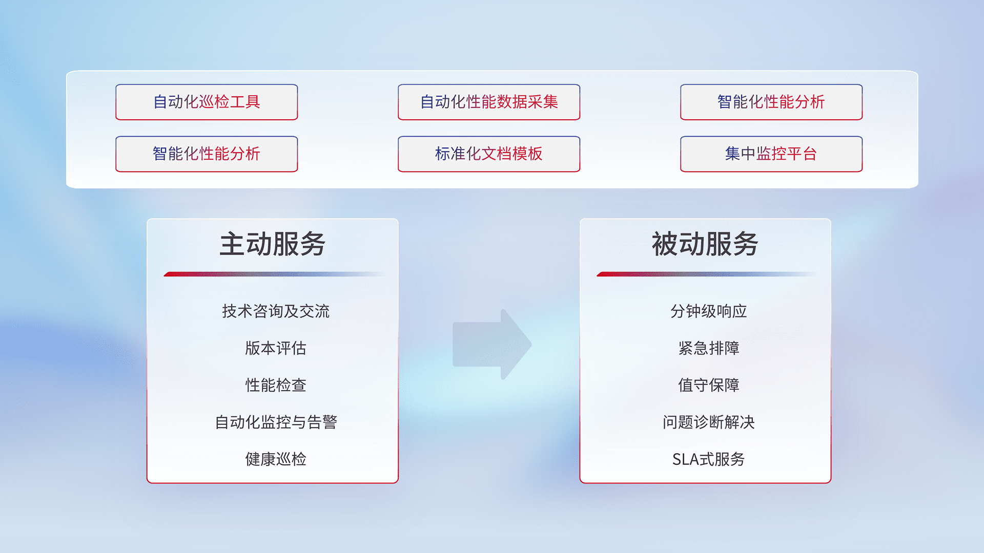 智能化工具和标准化文档,,保障服务质量,,提供主动服务(包含技术咨询、、版本评估、、、、性能检查、、、、自动化监控与告警、、、、健康巡检)和被动服务包含(分钟级响应、、、紧急排障、、、值守保障、、问题诊断解决、、、SLA服务)。。